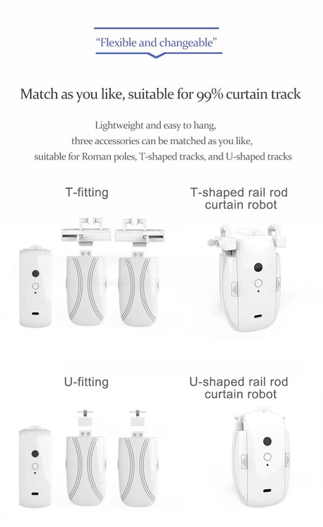 این ربات پرده مخصوص میل پرده های U و T هستند و با تعویض بازوها میتوانید هر دو نوع میل پرده را پشتیبانی کنید و همچنین از نرم افزارهای Tuya Smart و Smart Life پشتیبانی میکند
