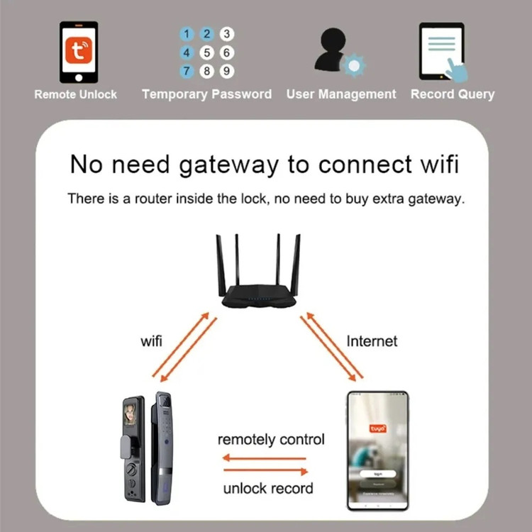قفل هوشمند درب شیائومی مدل Xiaomi Tuya Smart Door Lock 3D Face Fingerprint H20-3D انگشت شما کلید شماست: با استفاده از حسگر اثرانگشت نیمه هادی پیشرفته داخلی، قفل در را باز کنید. راحتی برنامه WiFi بهینه: از راه دور قفل درب خانه، دفتر یا ملک اجاره ای خود را از طریق راحتی تلفن هوشمند iOS یا Android خود از طریق WiFi ایمن در هر نقطه از جهان باز می کند. شامل دو کلید فیزیکی پشتیبان برای آرامش خاطر است. بدانید چه کسی میآید و میرود: تمام سابقه دسترسی را ذخیره میکند تا بتوانید هر زمان که خواستید از تلفن همراهتان افرادی را که میآیند و میروند مرور کنید. ظرفیت چاپ کف دست: ≤100 ظرفیت اثر انگشت: ≤100 زمان خواندن: ≤0.5S فرکانس WIFI: 2.4GHZ فرکانس کارت مغناطیسی: 13.56mhz
