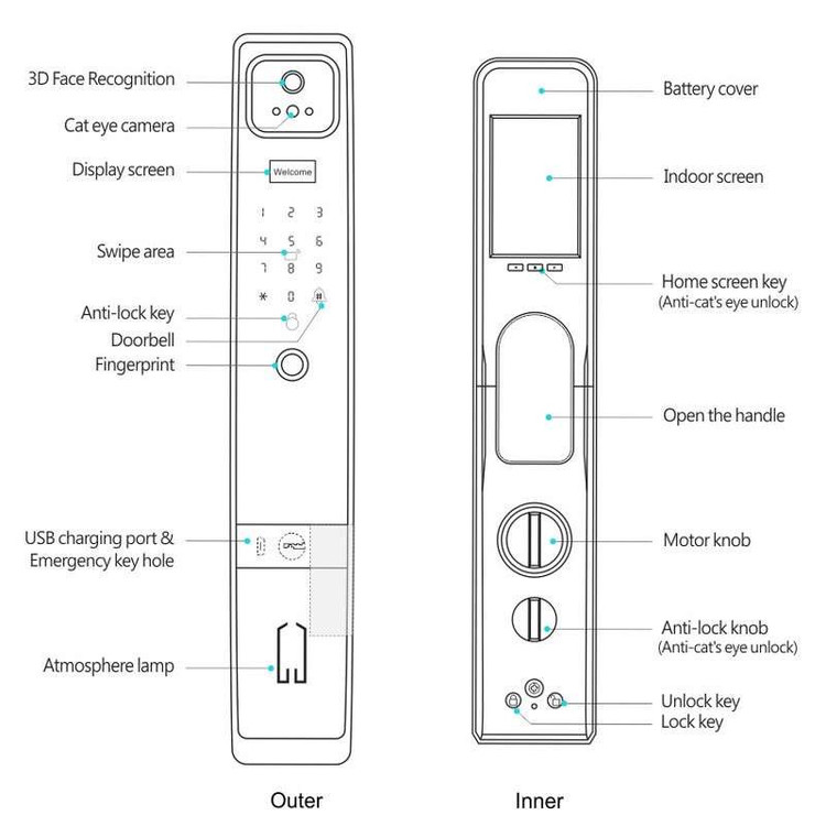 Unlock by: 3D Face,Fingerprint, Key, IC card, Password, App--
